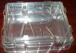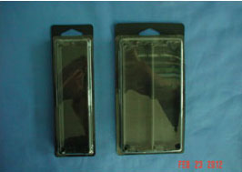 | PVC:通常表面泛藍光,也有白光PVC。PVC質軟,韌性強,可塑性好,可高周波撕邊封合。易著色,可做成透明和各種顏色,常用透明PVC包裝電子、化妝品、玩具禮品等產品。但PVC分解後會污染環境,逐漸被PET取代。片材成型厚度最大可達1.0 mm |