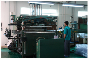 采用全自动吸塑成型机生产,我司所用之機械设备为台湾制造之设备 , 其基本原理是:将成卷的片材拉进固定位置後由电炉烘箱加热至软化状态,乘热时模具上移并抽真空,将软化的片材吸附到模具表面,同时将冷却水以雾状喷于成型片材表面,使其硬化,成型的片材再自动被拉至完成区,气动裁刀将成型与未成型片材切开,从而完成全部过程。